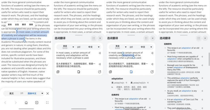 随着专业课程学习的不断深入,难免需要参考一些外文资料和前沿文献。面对专业英文术语,来回复制粘贴、一个个查单词太费劲!现在,华为浏览器可以长按页面,选取看不懂的文字段落,瞬间弹出快捷组件,点击“翻译”功能,即刻呈现精准译文。对于不明白的关键术语,华为浏览器还内置了“词典”功能,选中词汇和词典图标,系统会直接给出单词的解释和例句,帮助你快速消化学习,跟语言障碍说拜拜!